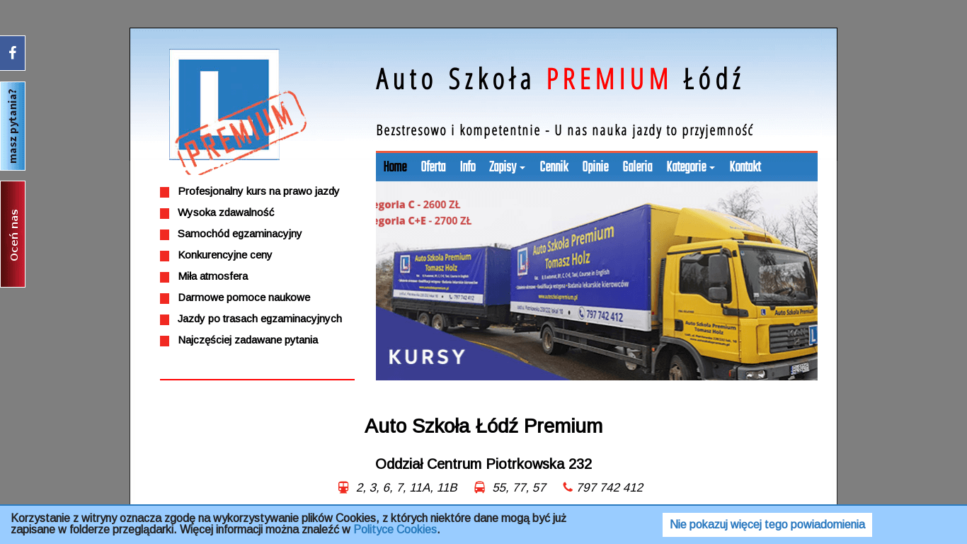 Mnogość dostępnych kursów oraz elastyczne terminy spotkań w trakcie współpracy to znaki rozpoznawcze oferty firmy Auto Szkoła Premium z Łodzi. Chętni mogą zdecydować się na przygotowanie do egzaminów państwowych pod okiem instruktora na prawo jazdy, zarówno dla kategorii A, A1, A2, AM, B, B1, B+E, C, C+E, jak i D. Każdy kurs prawa jazdy w Łodzi, realizowany przez placówkę ma konkretny zakres, np. podstawowy lub rozszerzony, realizowany w ciągu tygodnia, weekendowo lub jako spotkania doszkalające, w zależności od potrzeb kursantów, w celu umożliwienia im indywidualnego planowania nauki.
